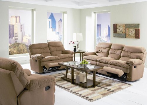 Harmon Reclining 3-Pc Sofa Set by Coaster This Reclining Sofa is designed to cater to your comfort preferences. Plush padded microfiber in a neutral brown adds a level of softness that will be most welcome in your living room or family room. Padded seats and pillow-style armrests combine with built-in motion features to provide an unsurpassed level of comfort. A coordinating love seat and chair can be added to complete your living room group. The Harmon Motion Collection includes built-in reclining features that promote complete relaxation for you and your guests. Plush, padded microfiber in an easy-care brown wraps each piece, adding softness and creating a warm and inviting space for relaxing or gathering with friends. Pillow-style armrests top either end for added support, while built-in motion features allow you to effortlessly recline to your preferred position. Group this reclining love seat, sofa and chair in your living room, family room or den and enjoy the superior comfort of